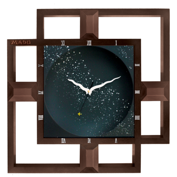 The clock symbolizes infinity of universe, time, and space, and one's thirst for their overcoming. Here and there
