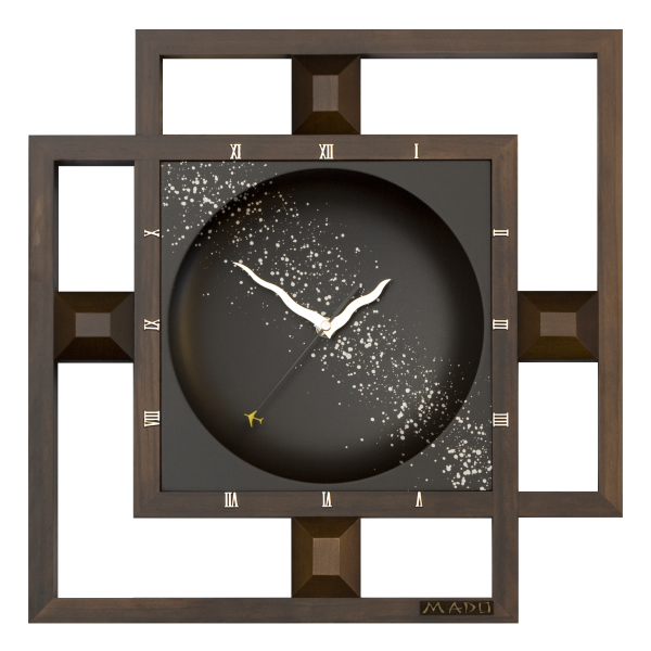 The clock symbolizes infinity of universe, time, and space, and one's thirst for their overcoming. Here and there